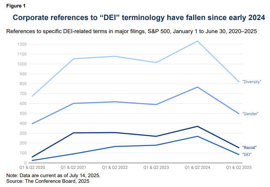 As the landscape for diversity efforts in the US has evolved in 2025, many companies have adapted by refining how they present these initiatives in public communications and filings— often by reducing the use of explicitly racial or DEI-branded terms to mitigate legal exposure and reputational risk (Figure 1). The sharp decline in references to “diversity,” “racial,” “gender,” or “DEI” indicates a strategic distancing away from terminology viewed as politically sensitive.