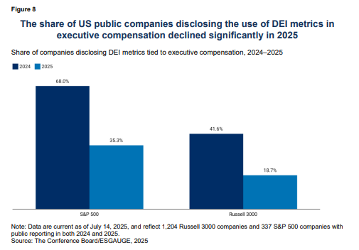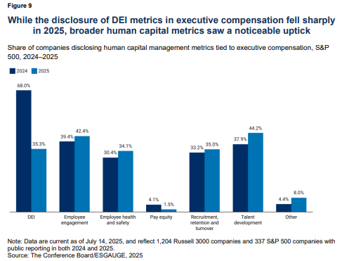 - Disclosure of DEI-linked executive pay incentives declined sharply in 2025 amid legal and reputational concerns, although some firms appear to be reframing incentives around broader human capital priorities such as talent development and employee engagement.