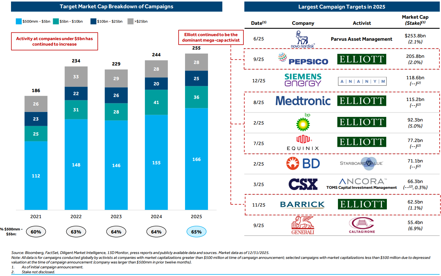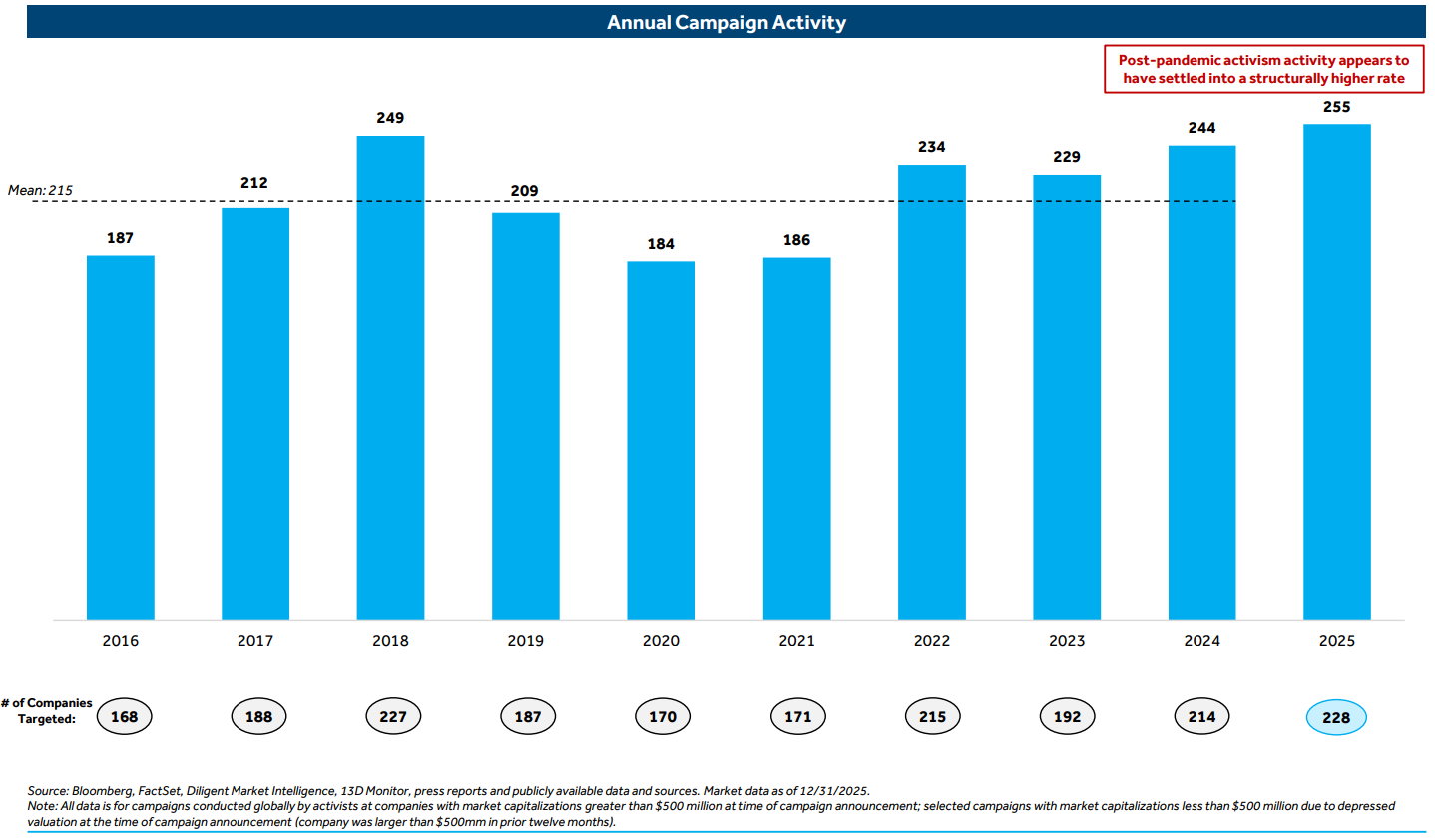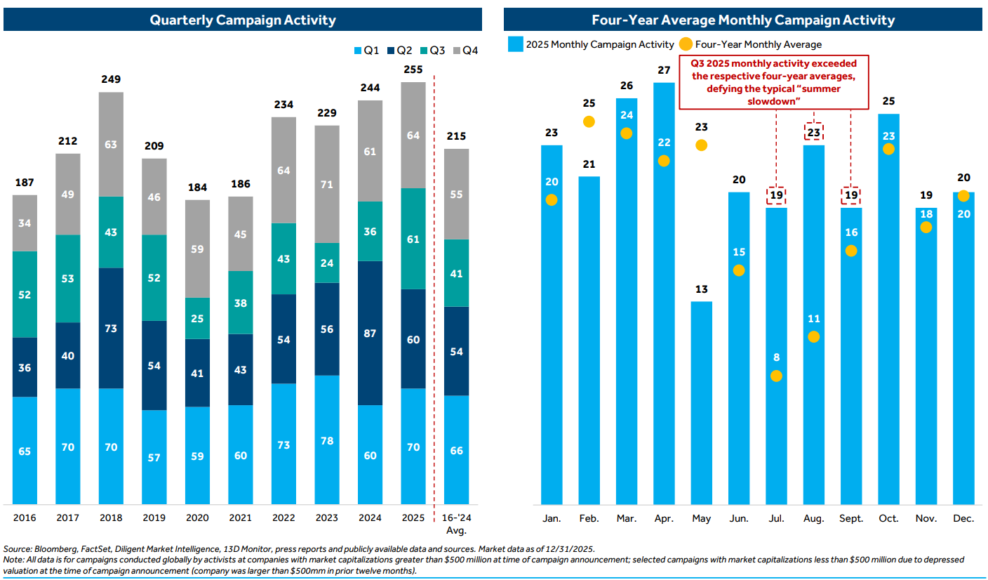 2025 set a record for activist activity with 255 campaigns, surpassing the previous high of 249 in 2018