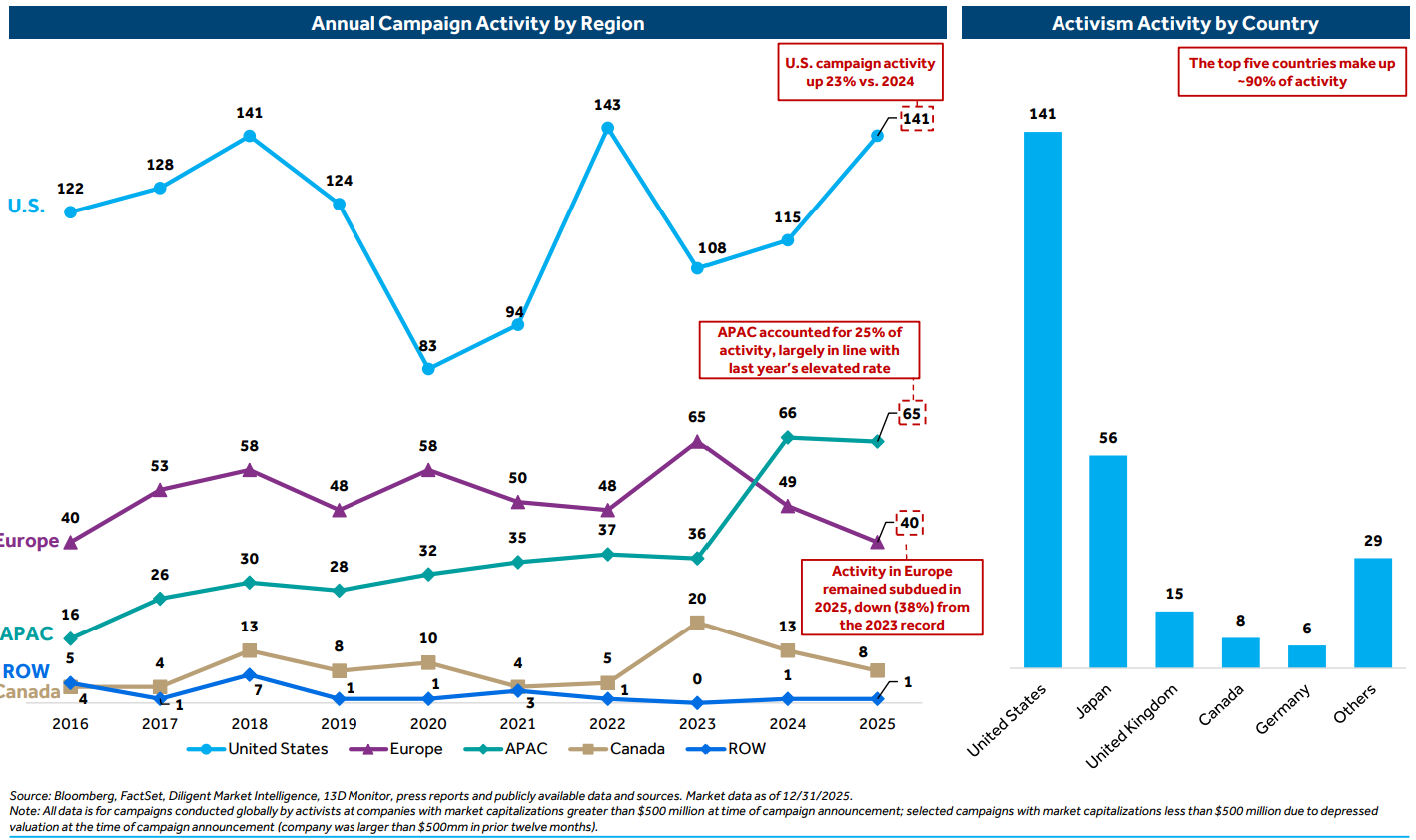 Activity in the U.S. accounted for 55% of all campaigns; the elevated pace of activity in APAC last year continued in 2025