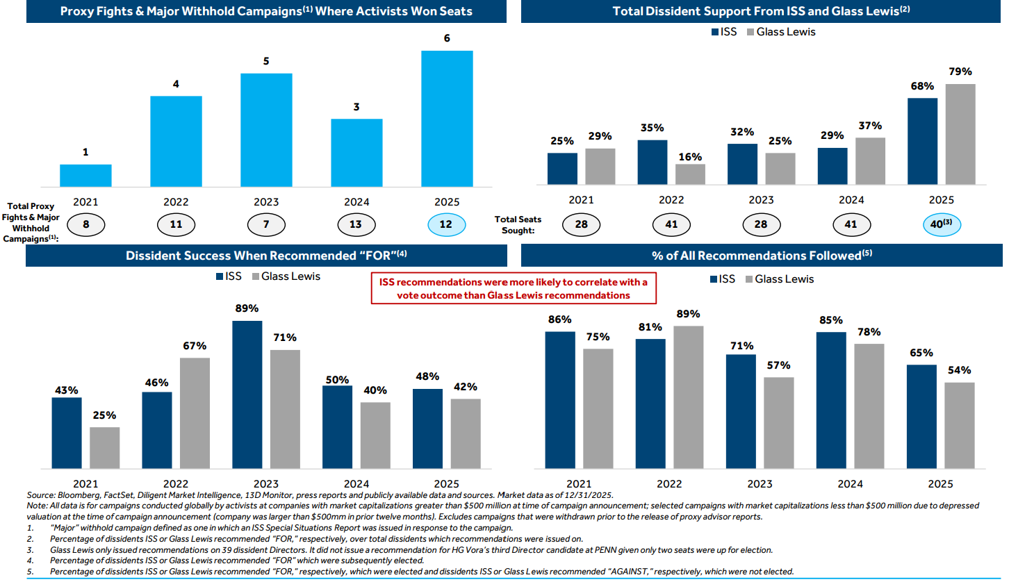 ISS and Glass Lewis were significantly more likely to back dissident nominees in 2025 but their support was relatively less meaningful in determining outcomes