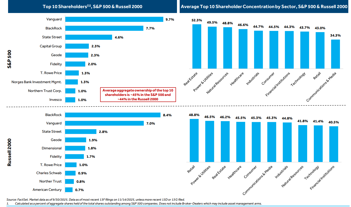 The “Big Three” (BlackRock, Vanguard, State Street) are the top shareholders of both the S&P 500 and Russell 2000, as passive investing concentrates ownership in fewer hands